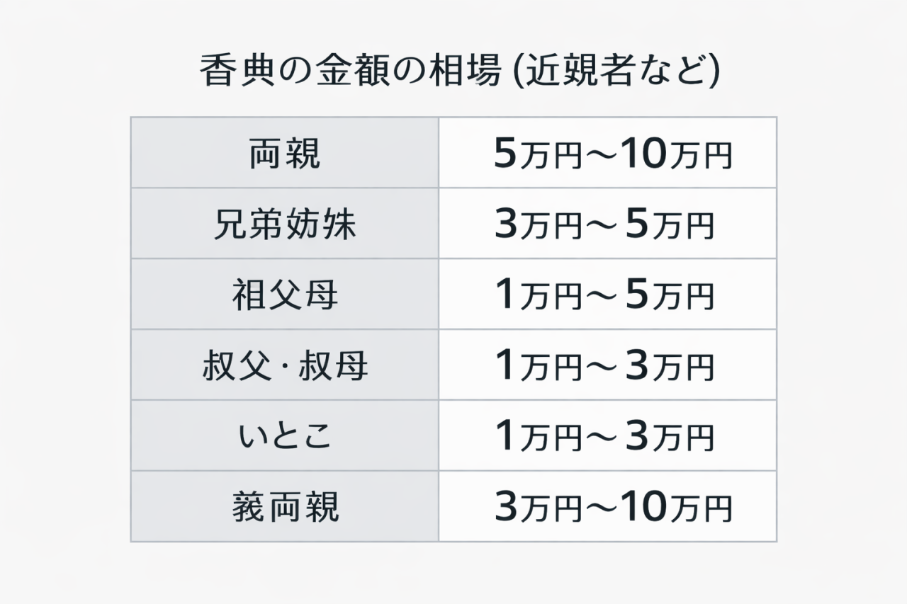 親族への香典は、関係が近いほど高額になります。両親なら5万〜10万円、兄弟なら3万〜5万円、祖父母なら1万〜3万円が目安です。自分が20代など若年層であれば少なめに、年齢が上がるにつれて多めに包む傾向があります。また、法要の場合は食事(お斎)が出ることもあるため、その分を考慮して1万円程度を上乗せすることもあります。