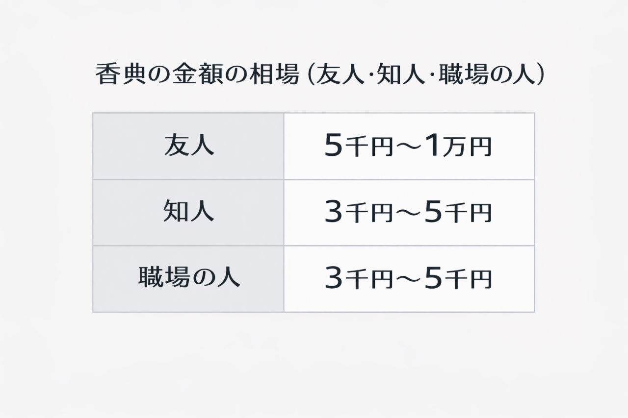 友人や職場関係の場合は、5,000円〜1万円が最も一般的な相場です。特に親しかった友人の場合は1万円、顔見知り程度であれば5,000円、あるいは連名で3,000円ずつ出し合うこともあります。職場の場合は、部署ごとの慣習があることが多いため、まずは同僚や先輩に相談するのが一番確実です。会社名を入れる場合は、名前の右側に少し小さく書き添えます。
