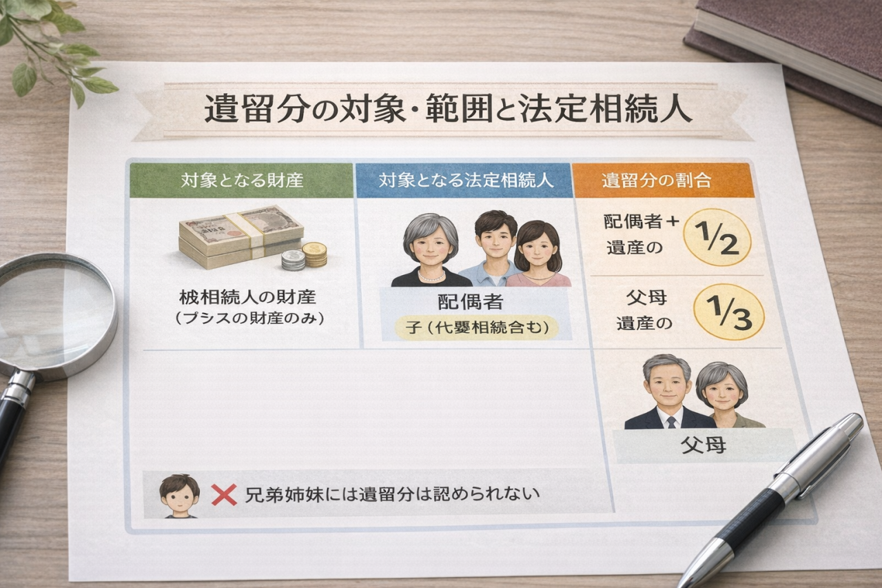 遺留分は、一定の相続人に保障された「最低限の取り分」です。 典型的には、配偶者・子・直系尊属が遺留分権利者になり、兄弟姉妹には遺留分がありません(そのため兄弟姉妹相続は揉め方が変わります)。